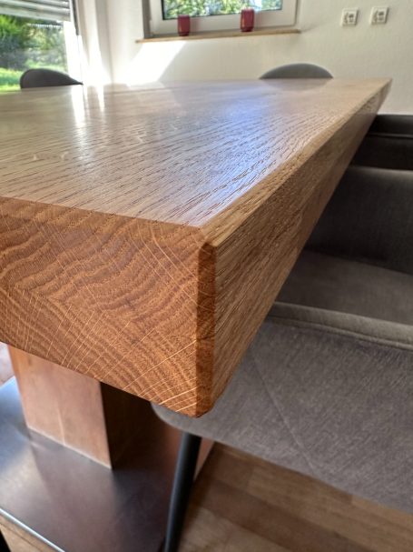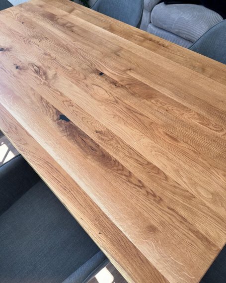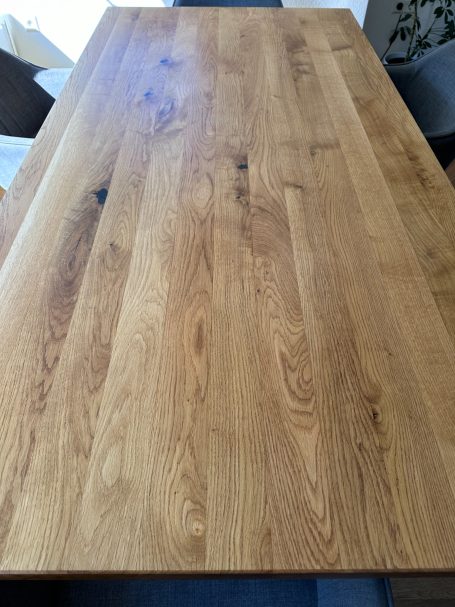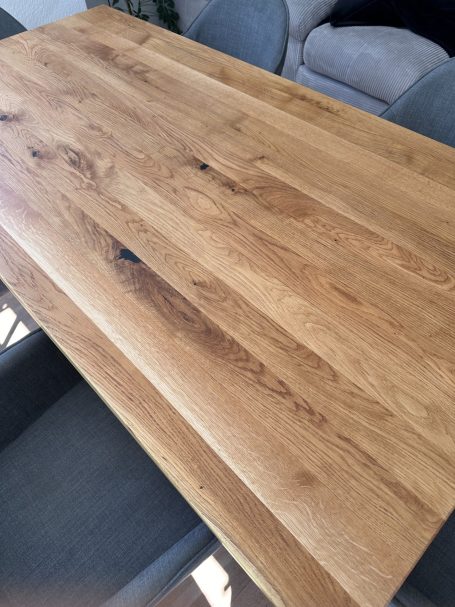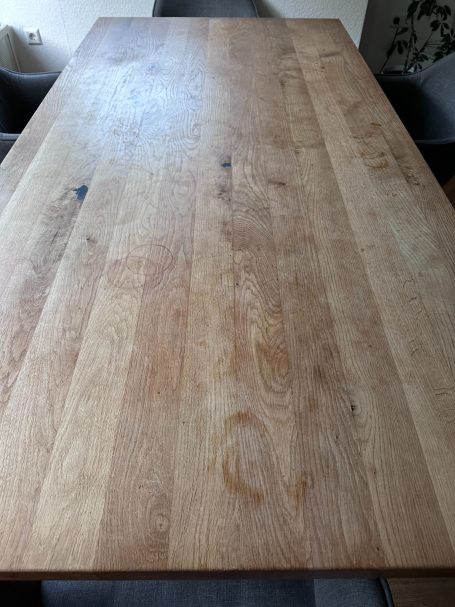 Wir schleifen Ihren Massivholz-Tisch in mehreren Arbeitsgängen vollständig ab,entfernen altes Öl oder Lack und arbeiten Kanten sowie Details sauber nach. Kratzer und kleine Schäden werden fachgerecht mit Hartwachs ausgebessert. Abschließend wird die Oberfläche mit hochwertigem Monocoat-Öl versiegelt - für ein Ergebnis wie neu.